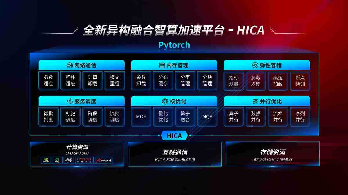 通过自研的服务层、、、中间适配层、、以及调度编排算法,,采用数据并行、、、、模型并行等多种并行方式,,,把并行计算任务进行有效的分解,,,,使其分别由相应的软件栈和算力资源来承接。。。当GPU资源变化,,,,HICA可以实时动态调度计算子任务并调整模型拓扑和架构,,,,以充分聚合各种算力资源。。。