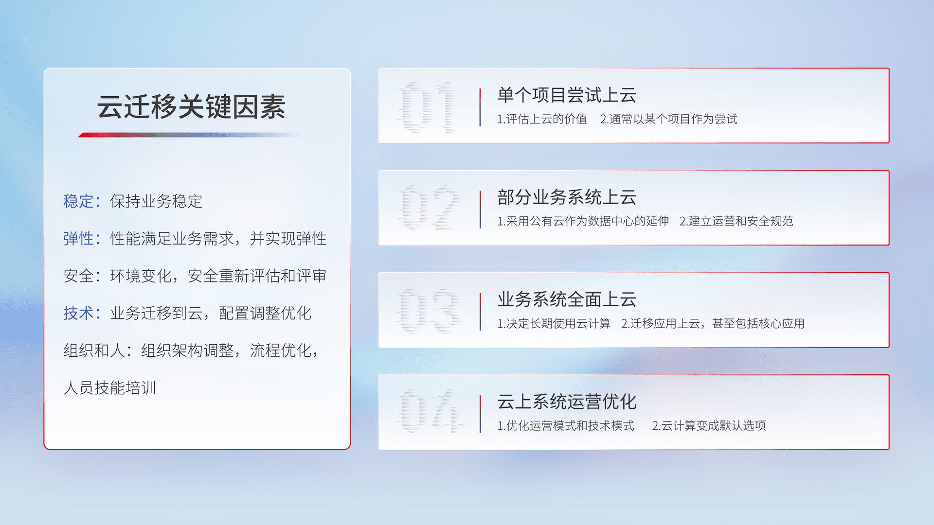 结合实际业务,,,,从规划设计、、、、云平台选型、、、云原生改造、、、数据迁移、、集成交付,,迁移全过程为客户识别最佳上云路径,,做好风险识别管理,,设计网络架构、、身份权限、、安全审计合规、、、操作审计、、、、日志审计、、、、监控告警策略、、、、多站点容灾设计等,,,对云上基础设施进行整体规划,,,提升IT治理水平,,,以满足弹性、、、高可用、、、、高性能的需求。。