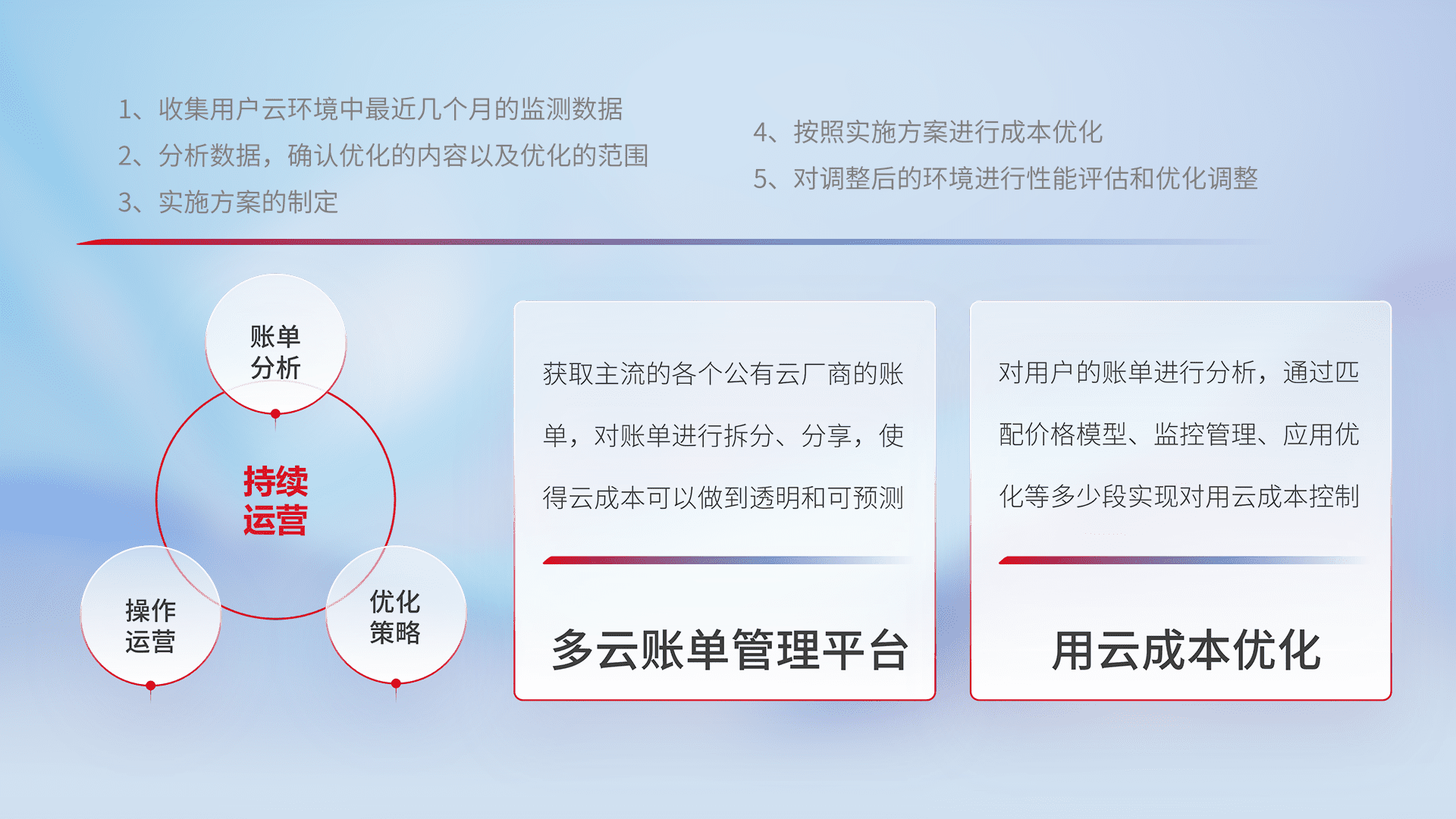 通过多云纳管,,,以统一的资源数据模型把客户的云资源进行抽象和封装,,,进而实现对多云资源的统一操作,,,保障云资源管理的可靠性、、、、稳定性与可用性。。。。量身定制化运维内容,,,,配置、、、、开发运维、、、、补丁管理、、、备份、、、、监控、、认证和访问管理、、、审计和日常巡检等,,保障在用云过程中的可靠度,,,稳定度以及高可用率。。
