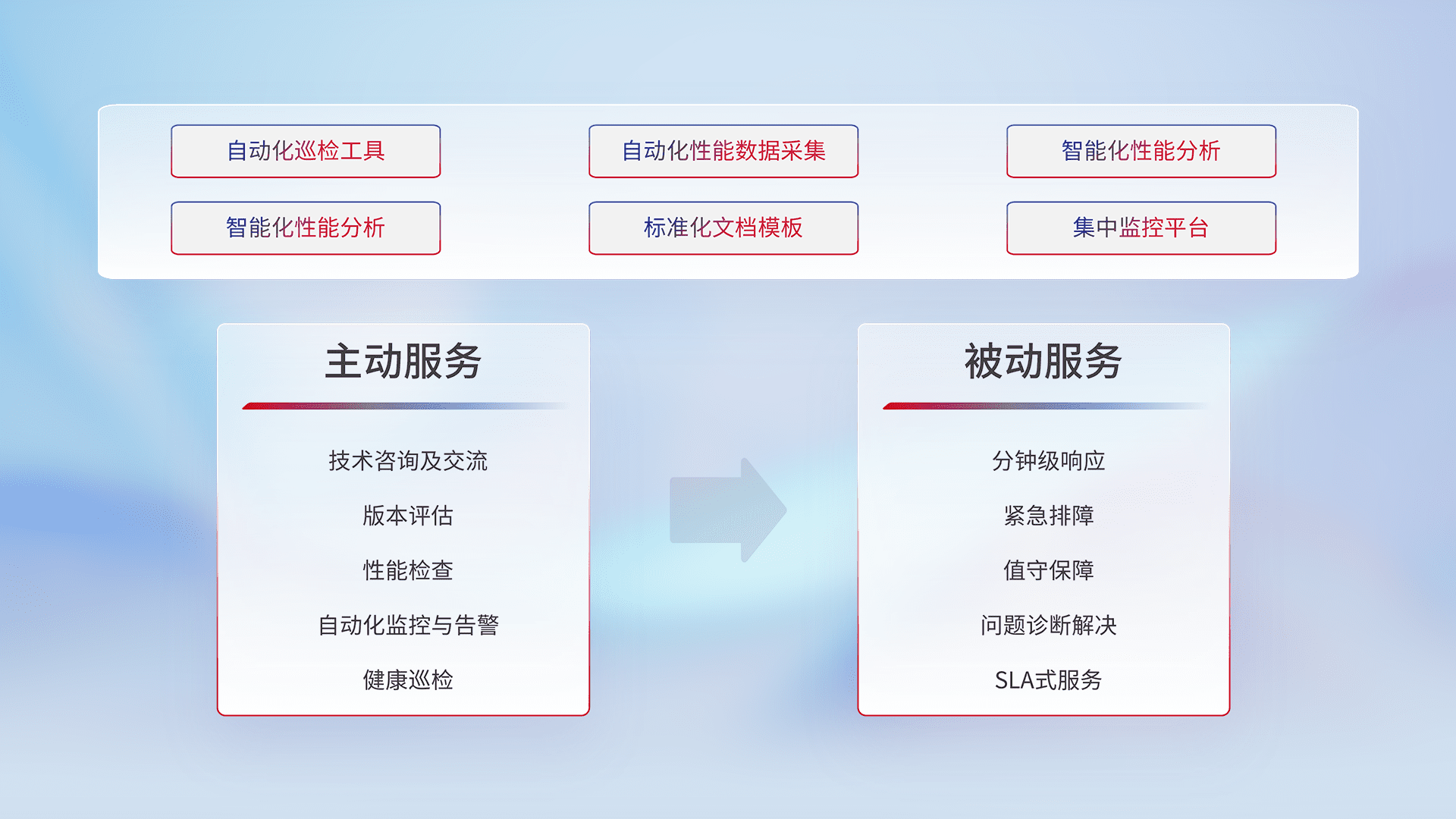 智能化工具和标准化文档,,,保障服务质量,,,,提供主动服务(包含技术咨询、、、版本评估、、、性能检查、、、自动化监控与告警、、、、健康巡检)和被动服务包含(分钟级响应、、紧急排障、、值守保障、、问题诊断解决、、、、SLA服务)。。